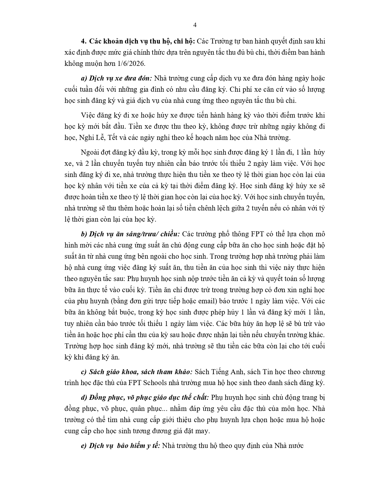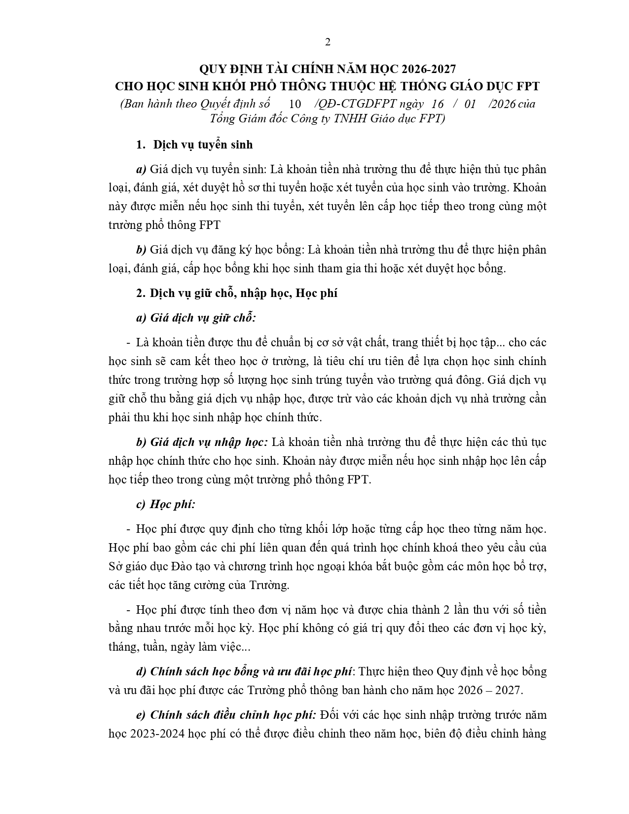 QUY ĐỊNH TÀI CHÍNH NĂM HỌC 2026 – 2027 CHO HỌC SINH KHỐI PHỔ THÔNG THUỘC HỆ THỐNG GIÁO DỤC FPT.