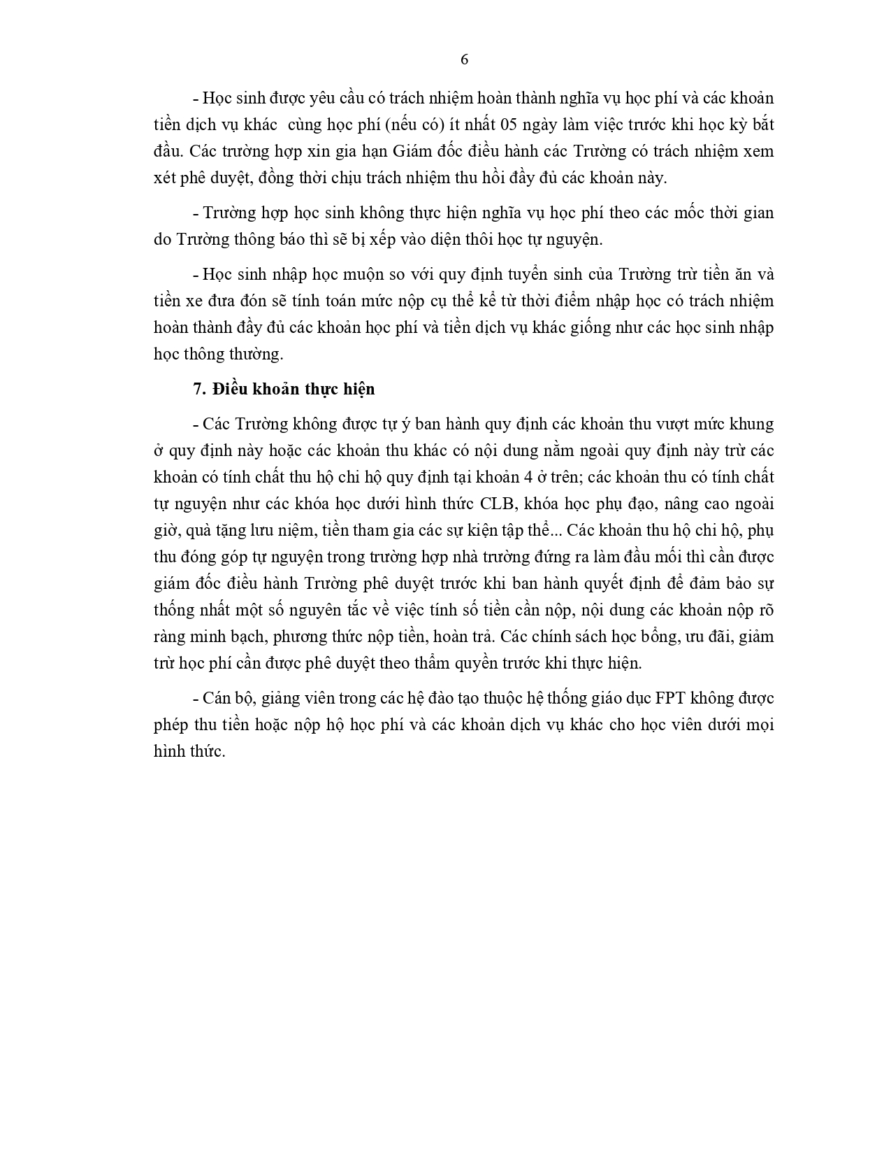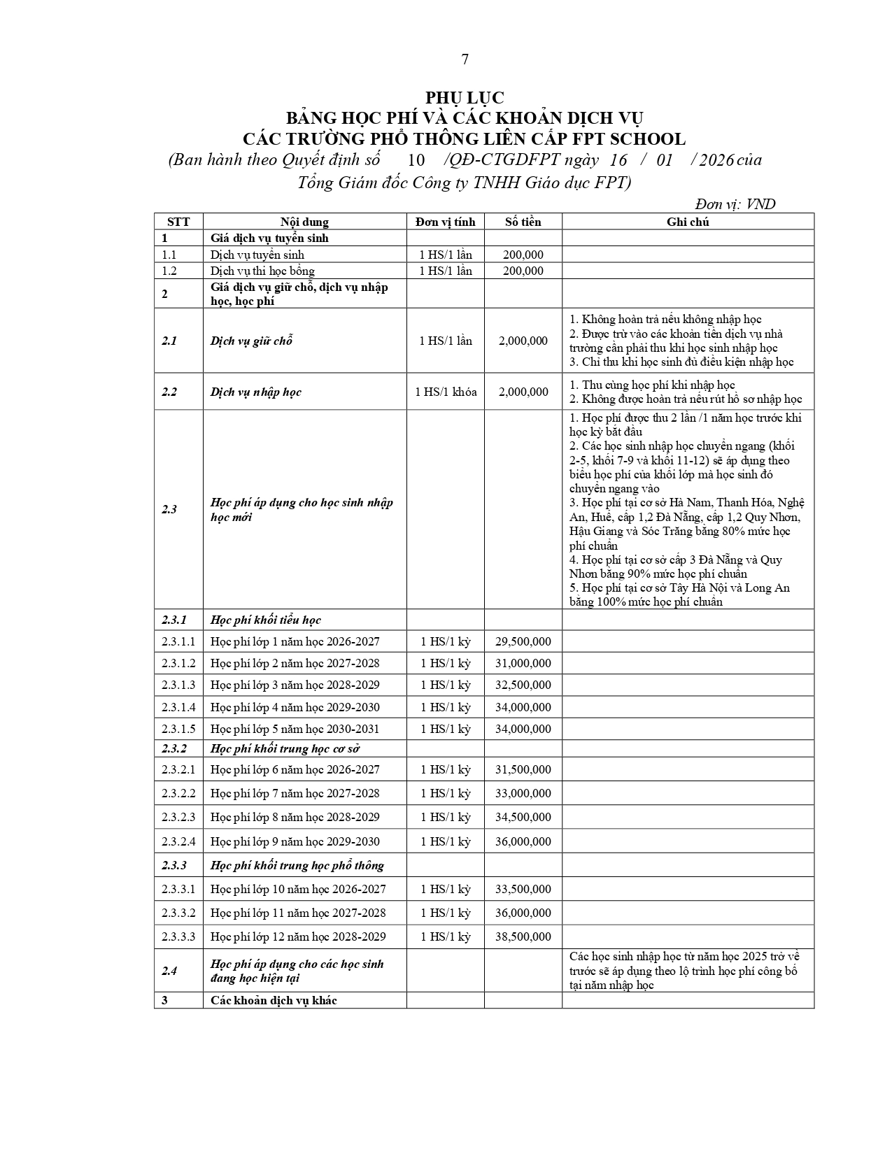 Ban hành Quy định tài chính năm học 2026 – 2027 cho học sinh khối Phổ thông thuộc hệ thống giáo dục FPT